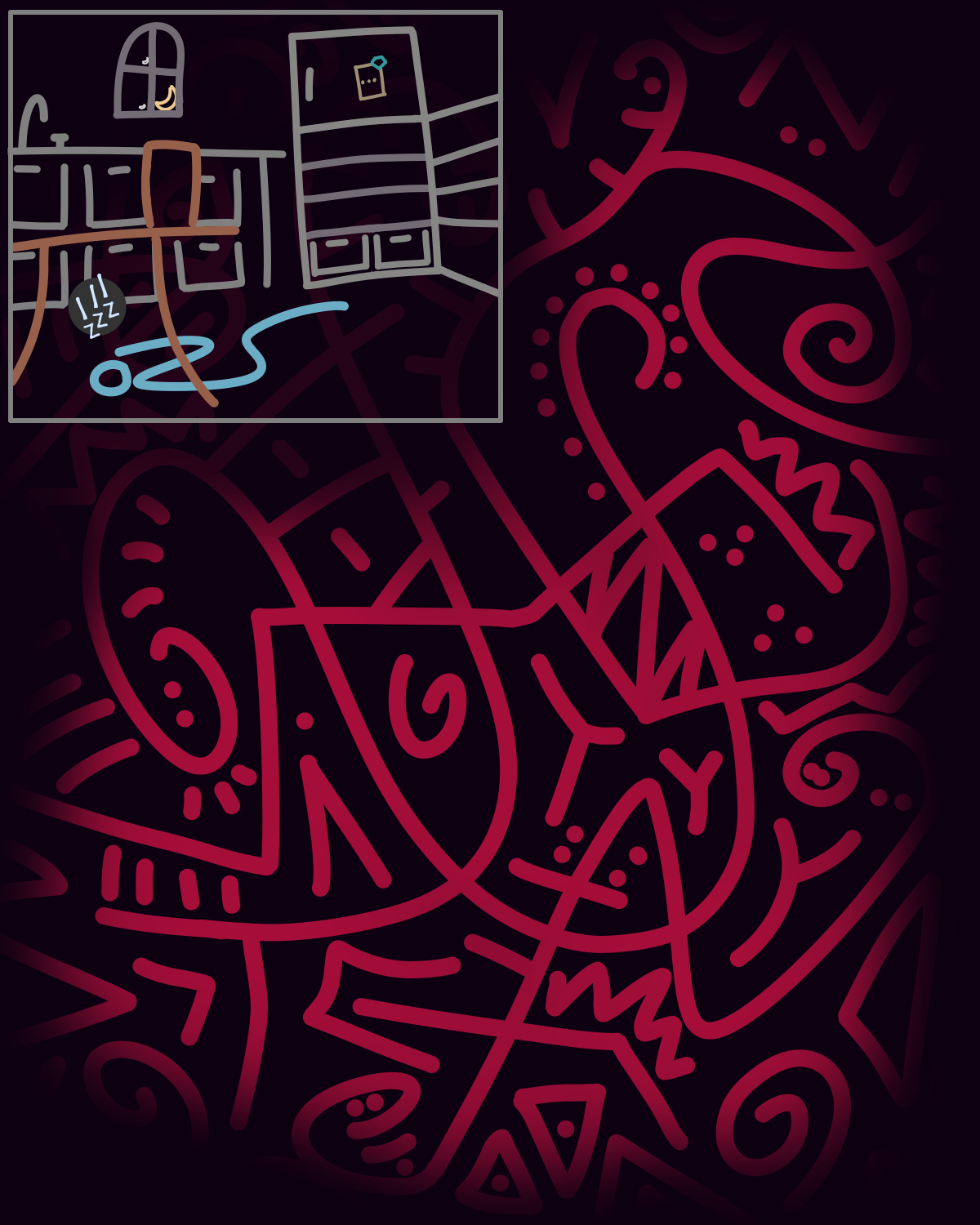 soweli Kijetesantakalu li tawa selo pi tomo insa li pilin e ona. “nnn… a!” ona li toki pi pilin musi: “mi ken ala ken kepeken uta kiwen sina?”